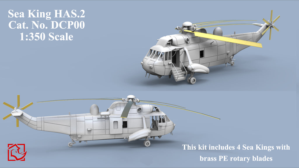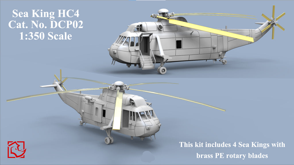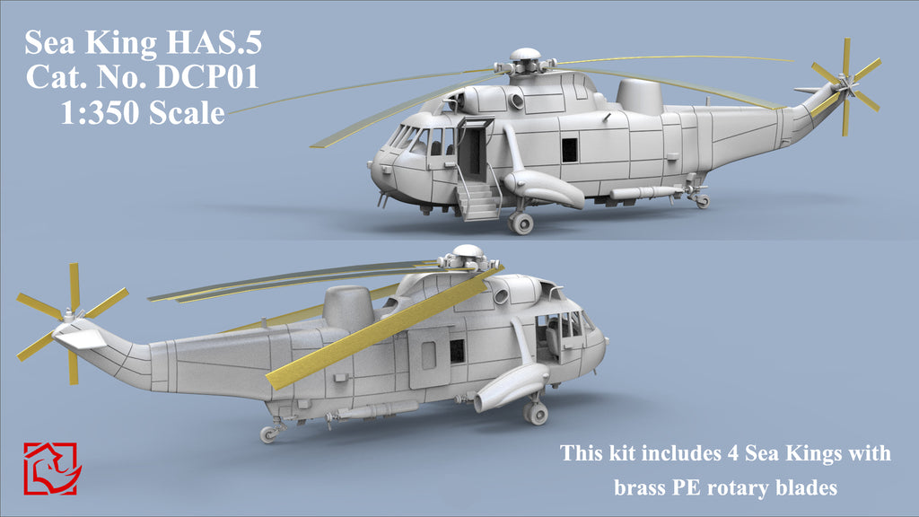 What you get: FOUR 1/350 scale "Sea King" helicopters unpainted and unassembled models. This kit includes photo-etched details and waterslide decals.
