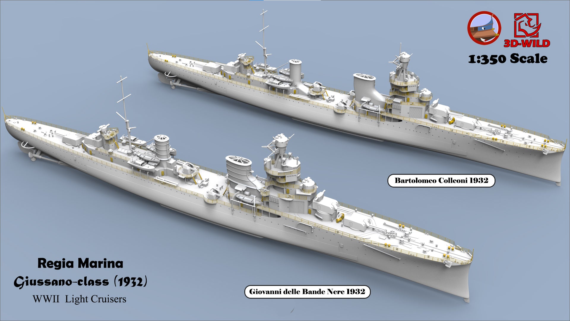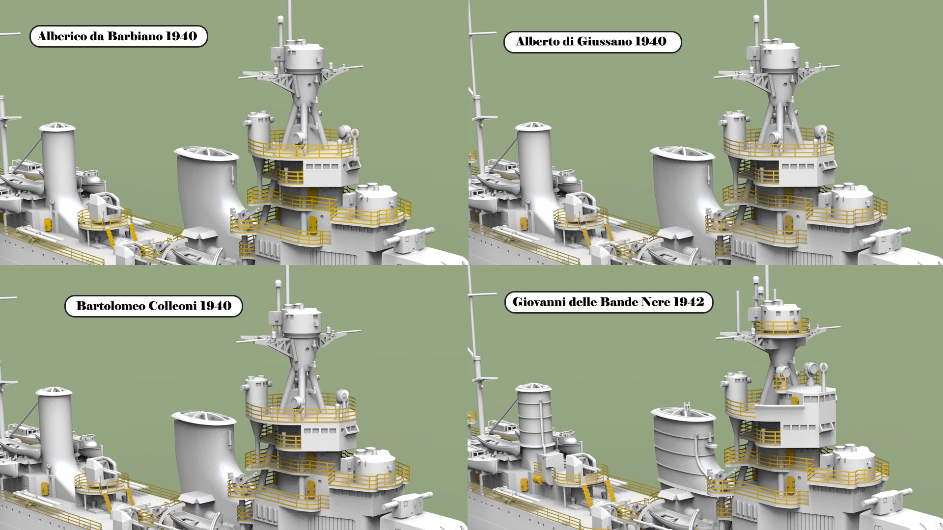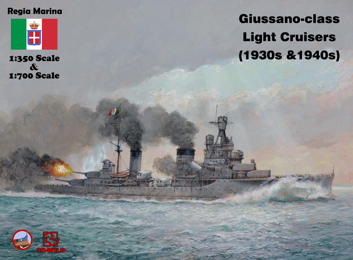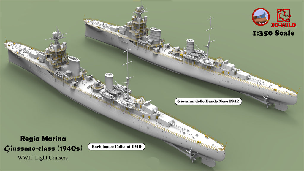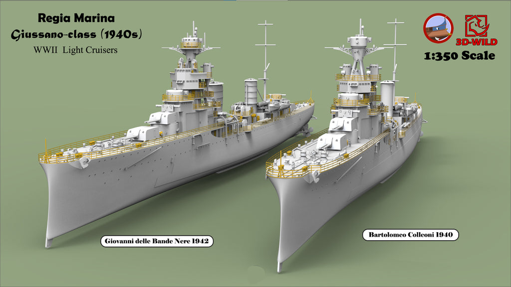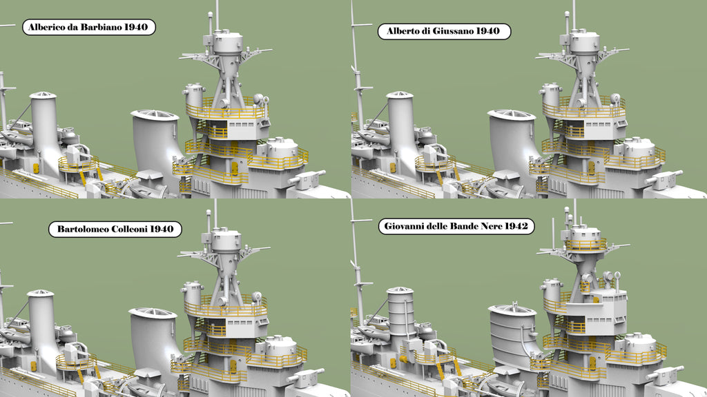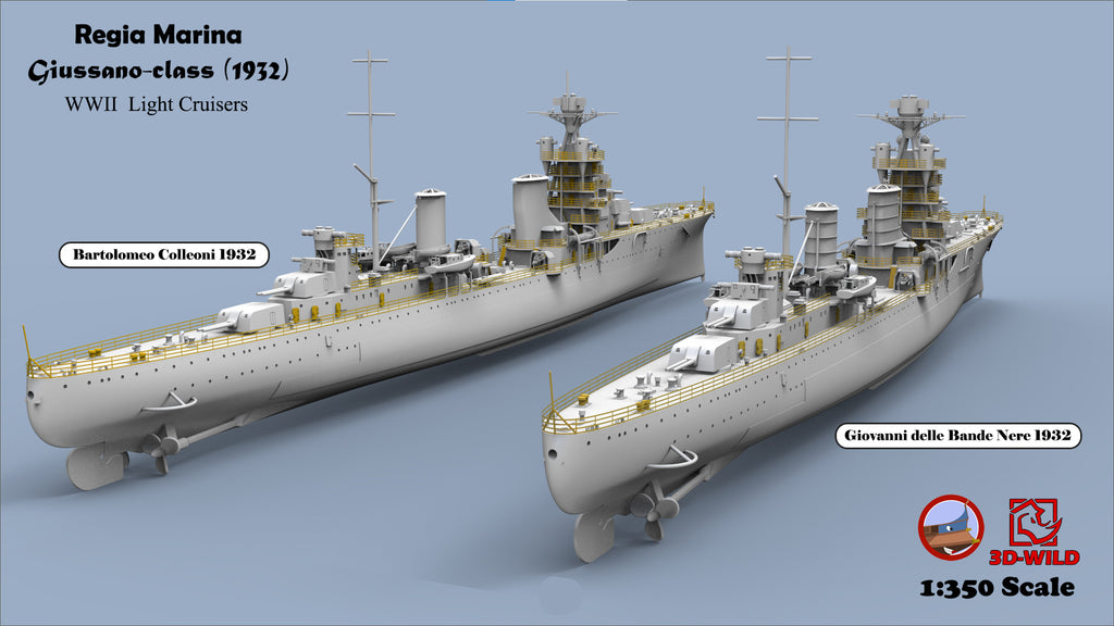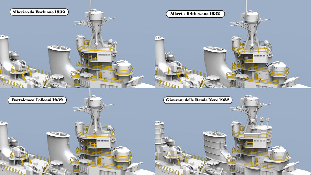 This class included four ships: Alberto di Giussano, Alberico da Barbiano, Bartolomeo Colleoni, and Giovanni delle Bande Nere. A total of 24 options are available, allowing modelers to choose exactly what they need — including specific ship, year, scale, and waterline or full-hull versions.