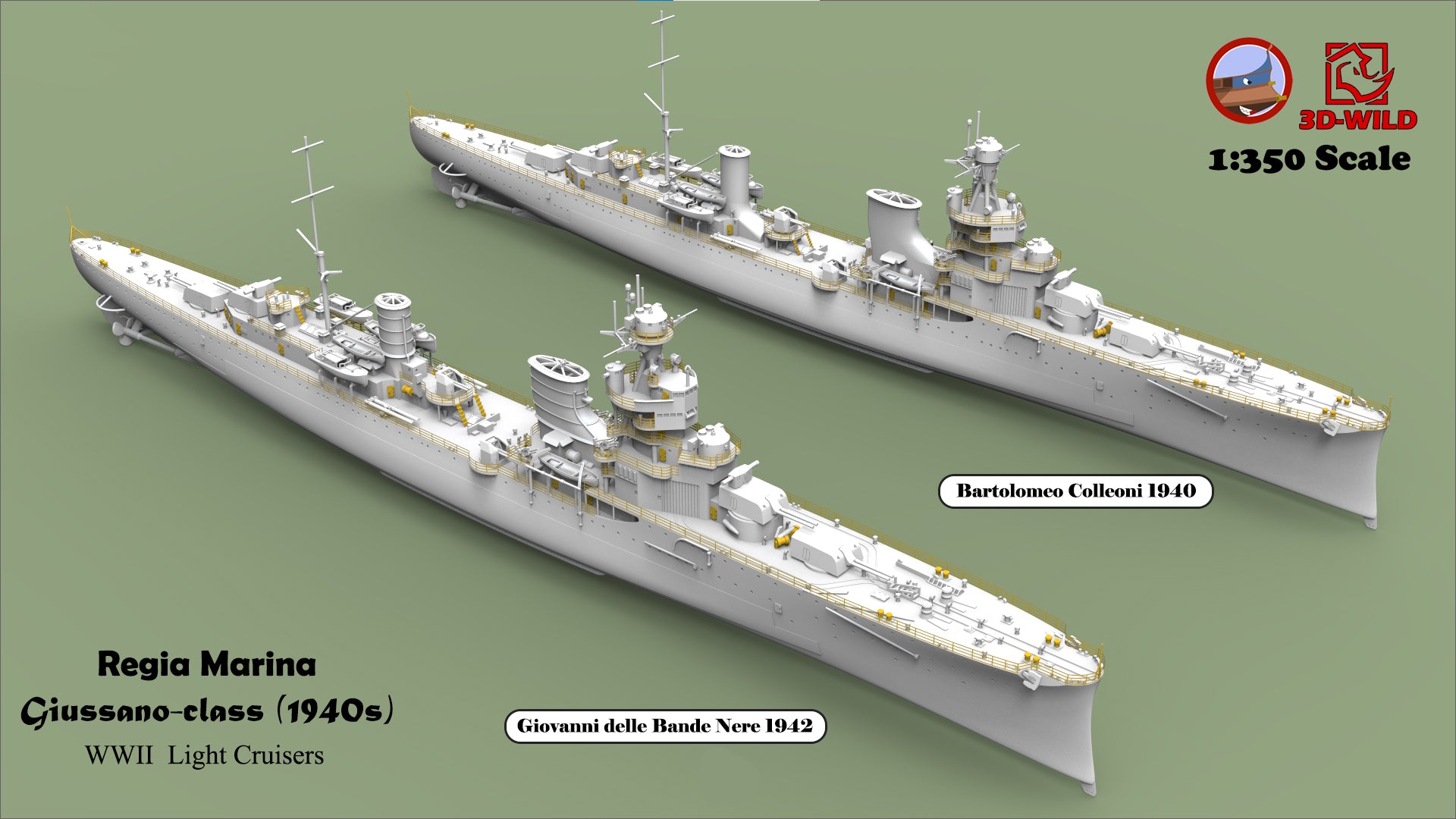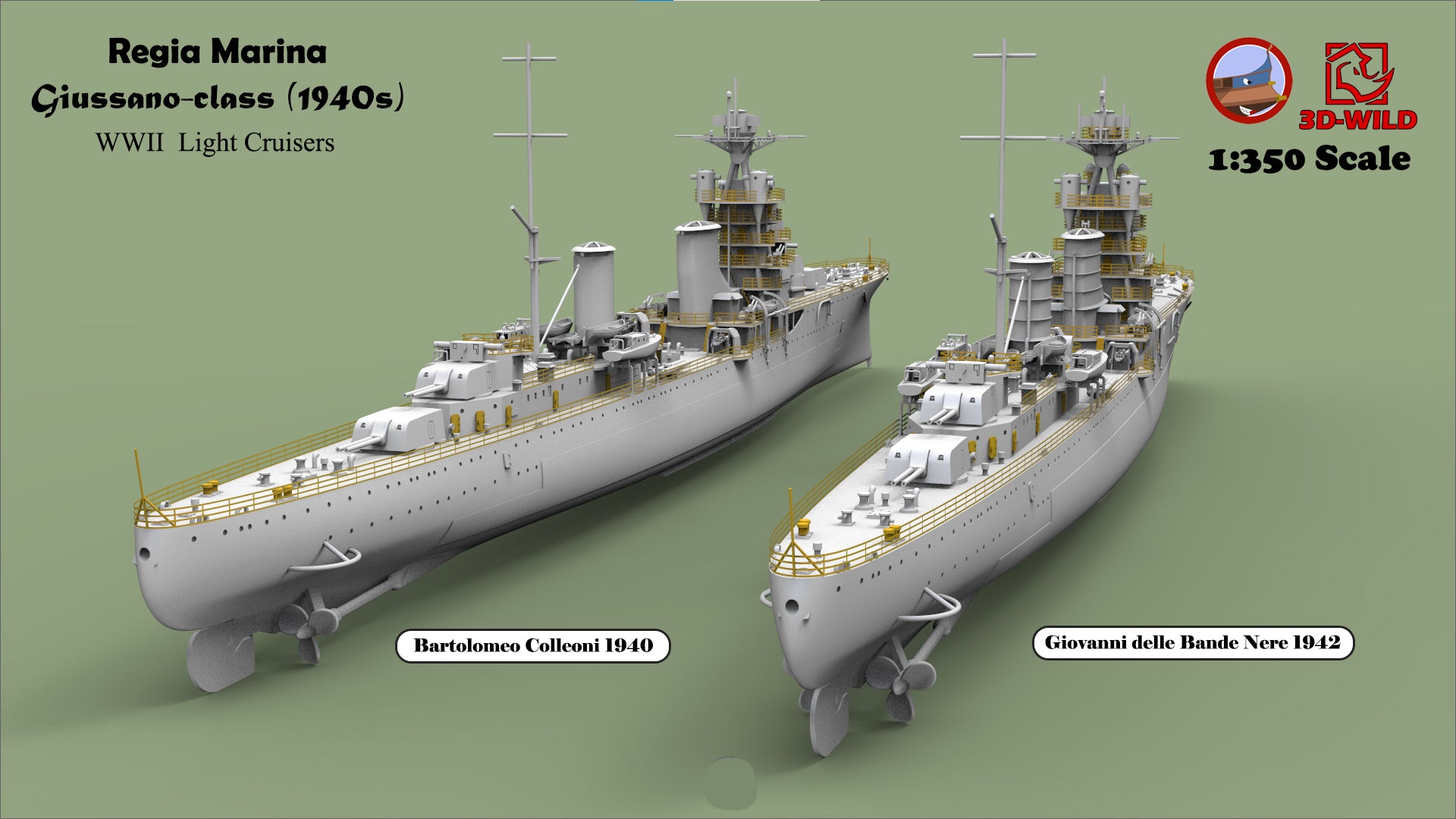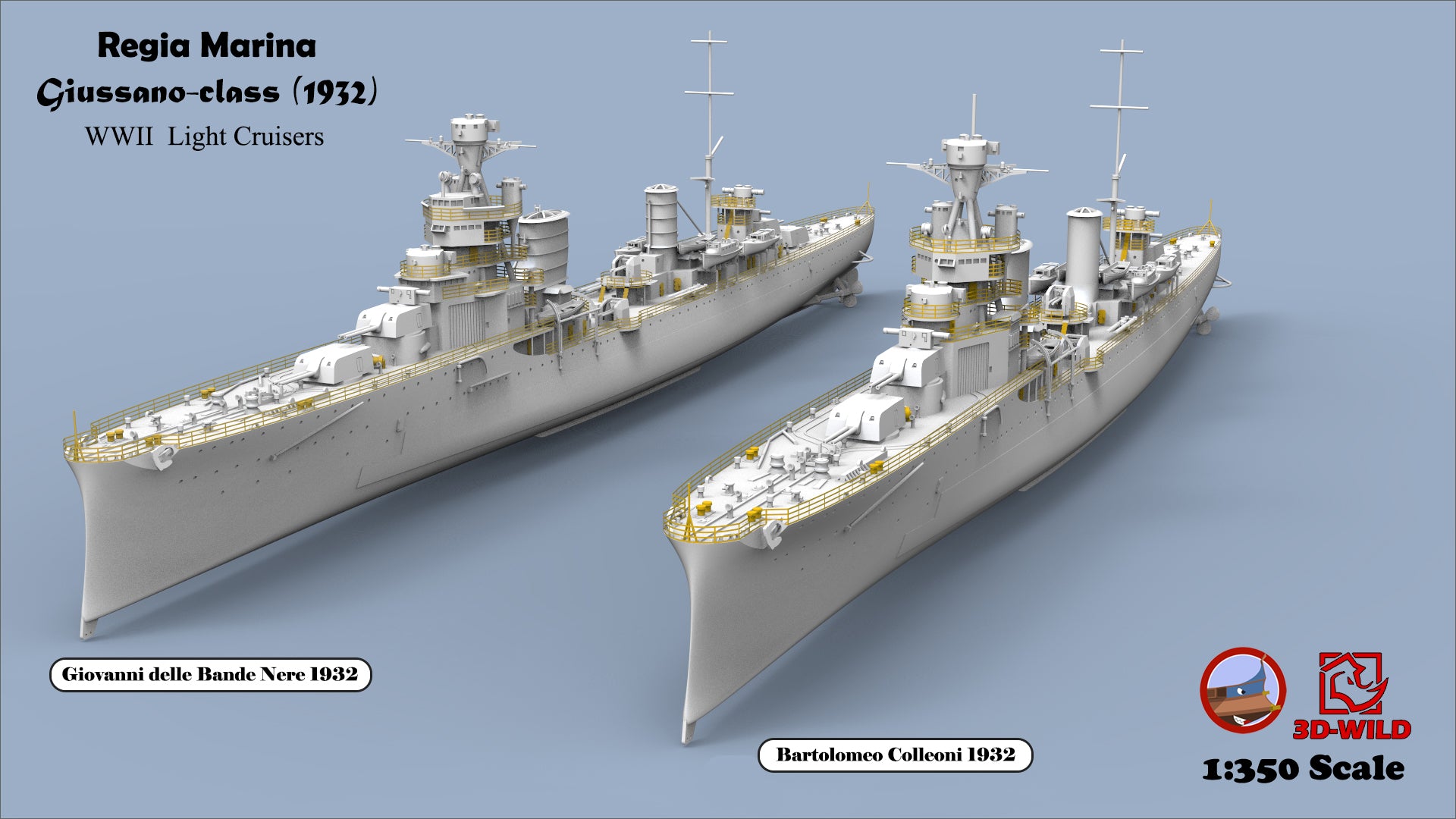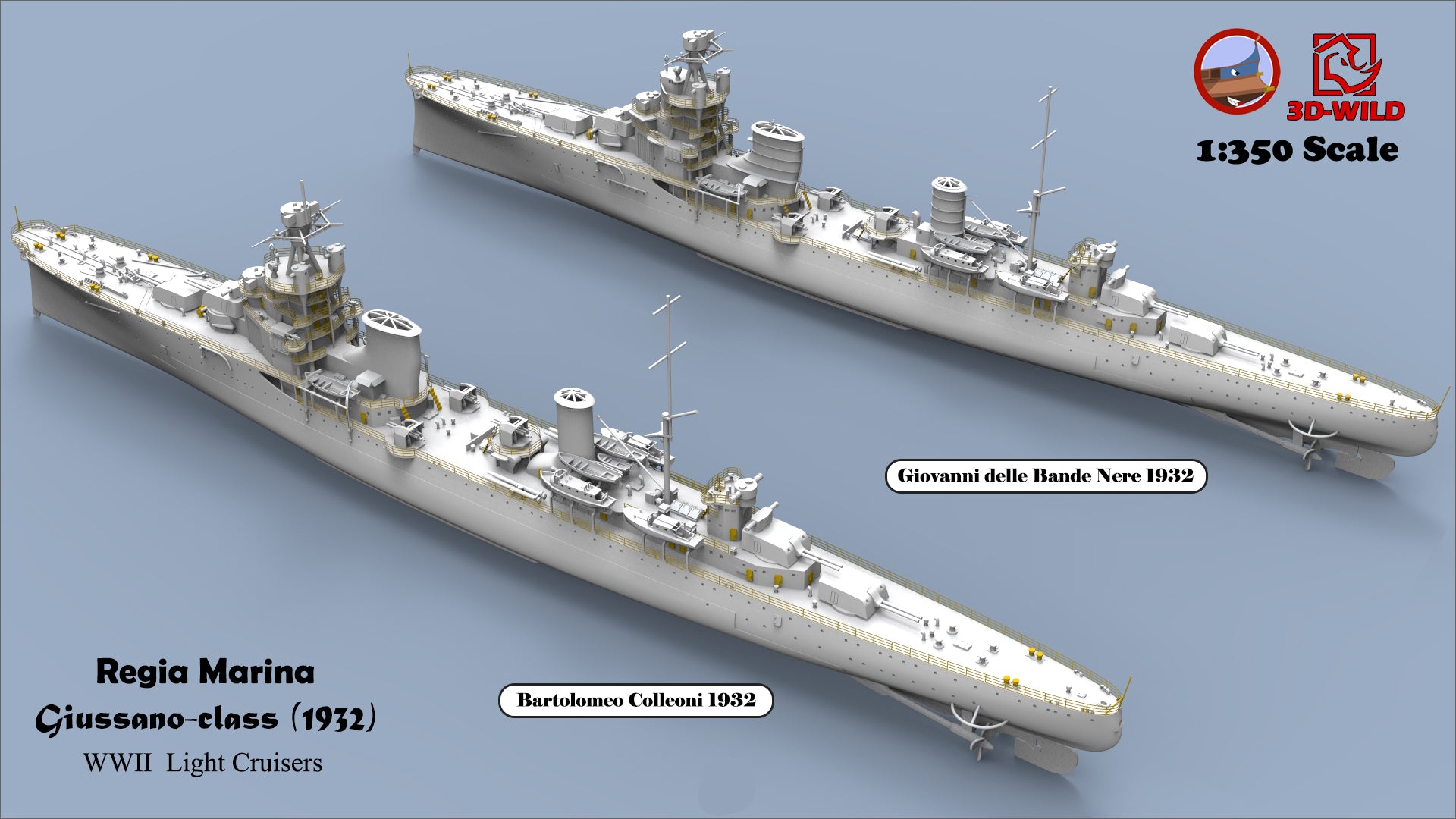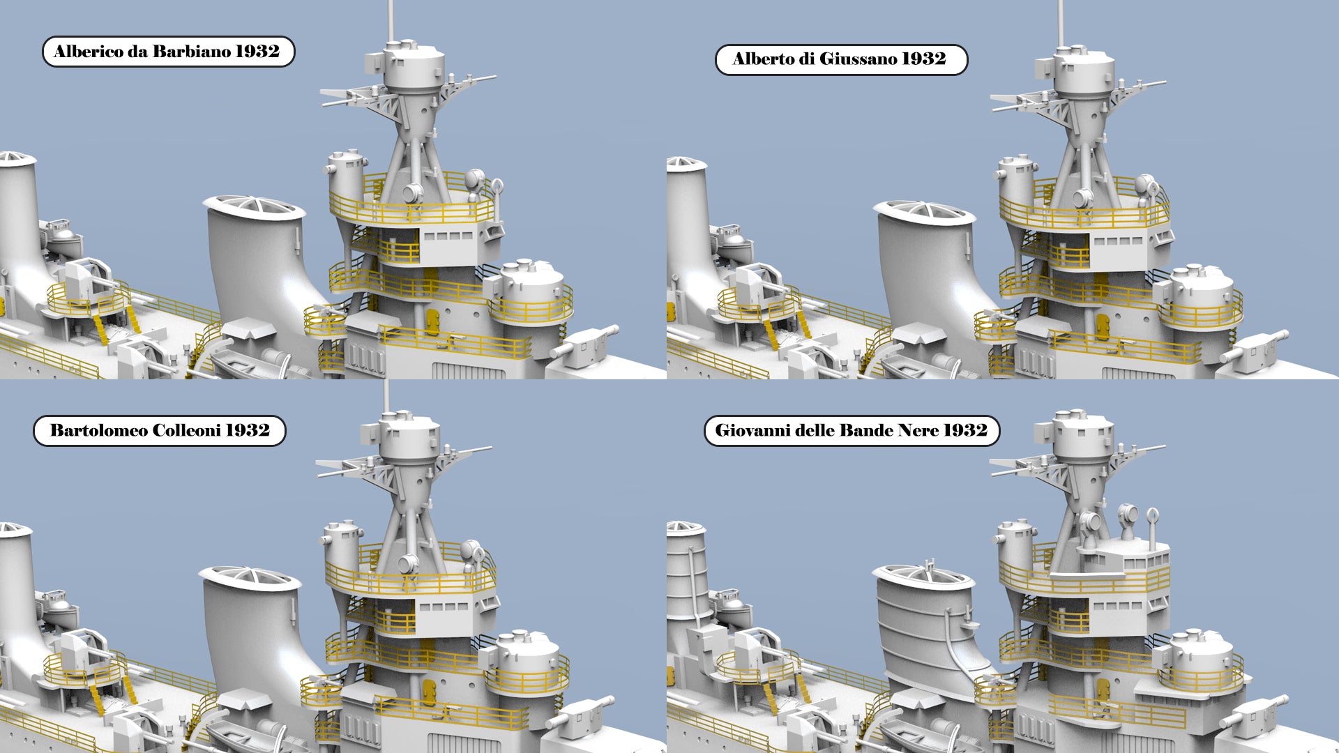 This class included four ships: Alberto di Giussano, Alberico da Barbiano, Bartolomeo Colleoni, and Giovanni delle Bande Nere. A total of 24 options are available, allowing modelers to choose exactly what they need — including specific ship, year, scale, and waterline or full-hull versions.